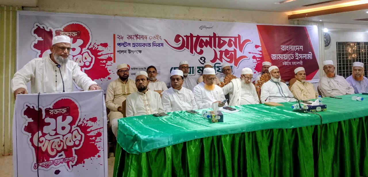 আজ (বুধবার) বিকাল ৪:৩০ মিনিটে দেওয়ানবাজারস্থ এক কমিউনিটি সেন্টারে চট্টগ্রাম মহানগরীর উদ্যােগে ২৮ অক্টোবর পল্টন হত্যাকান্ড দিবস উপলক্ষে আলোচনা সভা ও দোয়া মাহফিল প্রধান অতিথির বক্তব্যে তিনি এসব কথা বলেন।